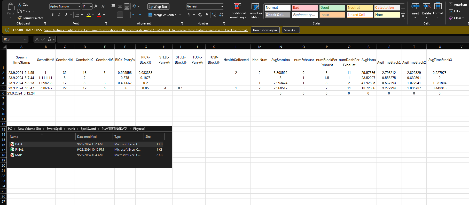 This is an example output of the telemetry model I developed for the game. It automatically organizes data, creating its own folder structure for storage. The data generated by the telemetry model is crucial for evaluating the stability of mechanics and understanding player experiences. Conducting playtesting sessions and collecting this data (with permission) has been an integral part of the development process.